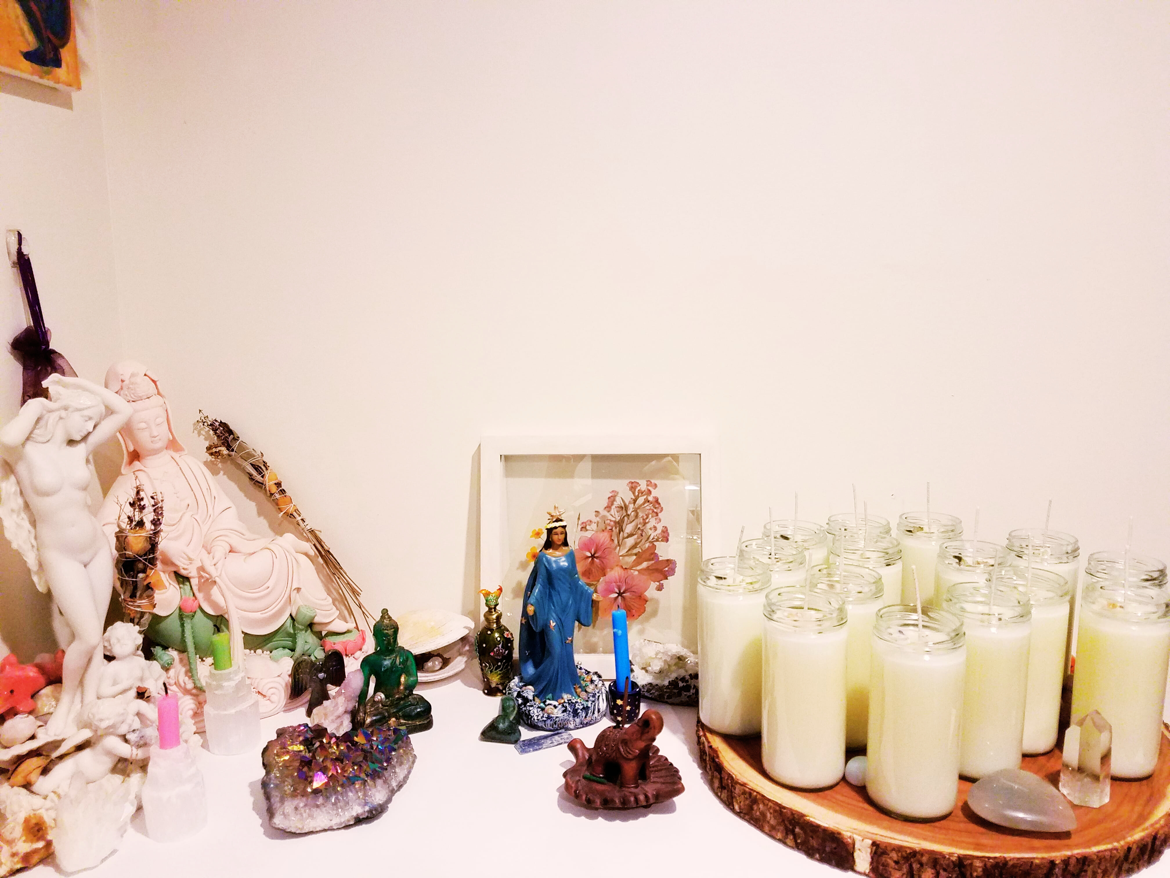 When a candle is finished, I place it on my altar for a few days. There it rests with selenite, moonlight, incense smoke, and other crystals so it can soak up clarity, softness, and protection. Sometimes I sing to them, like in this blessing of the moon candles:)